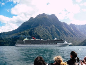Next, we cruised around Milford Sound on a catamaran. We actually went by some of our other friends that were kayaking through the fjord. Milford Sound is gorgeous!! It is one of the most beautiful places I’ve ever been. We saw a cruise ship going down the Sound and I thought about how cool it would be to do a cruise around here.